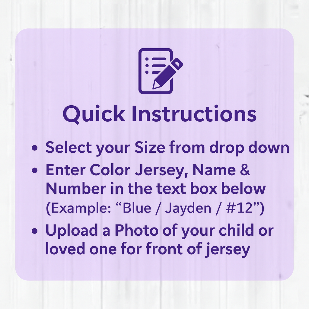 (Example: “Blue / Jayden / #12”) - Upload a Photo of your child or inspiration picture (optional).